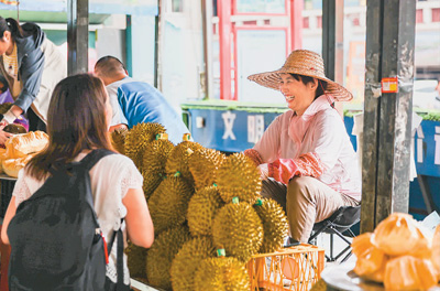 广西东兴,越南果商在售卖榴莲。